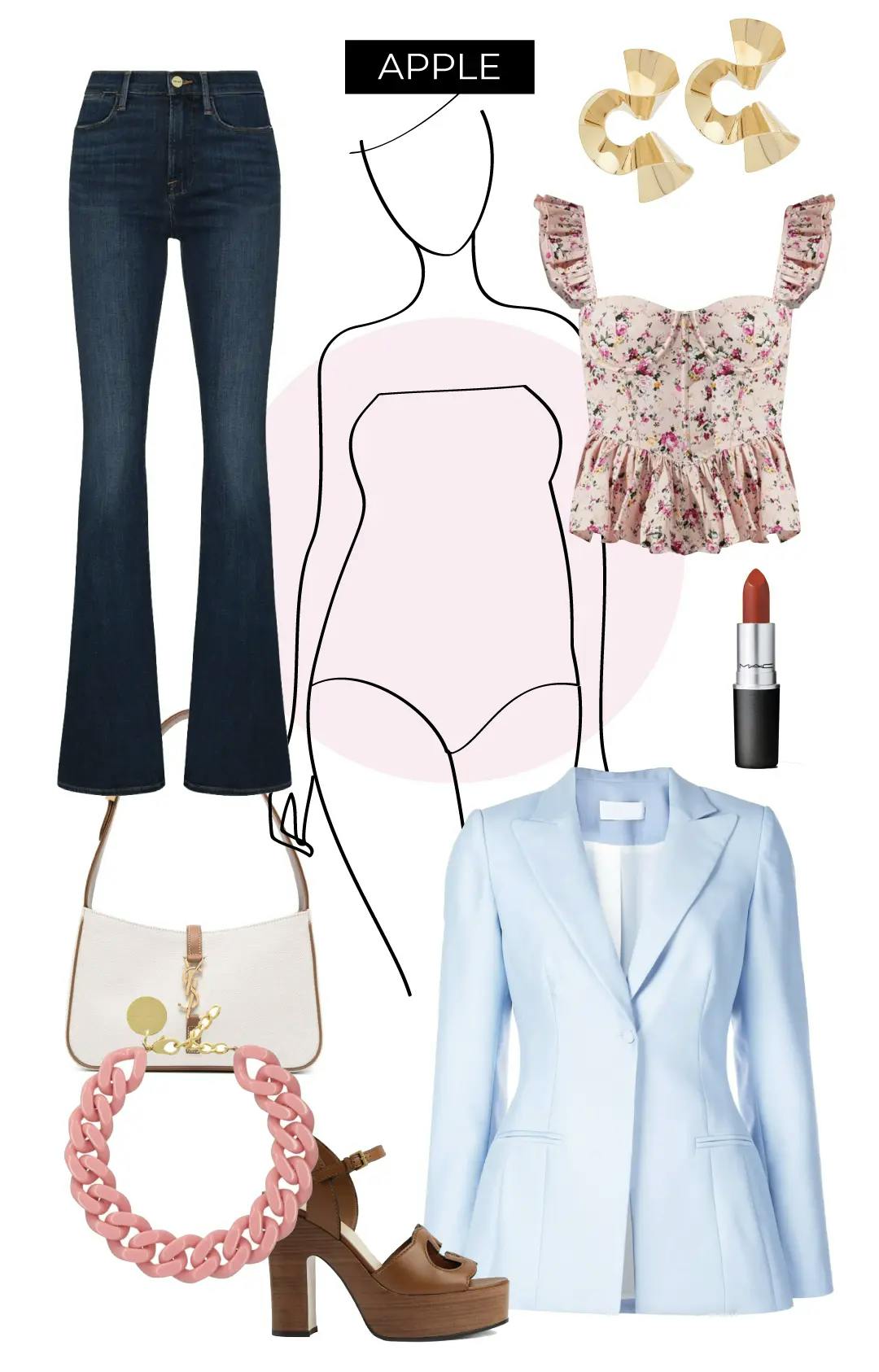 Apples carry their weight on the top half with a bigger bust and rounder tummy area. Flared pants or jeans are a great way to balance out your larger top half, whilst fitted blazers will create the curve of a waste.