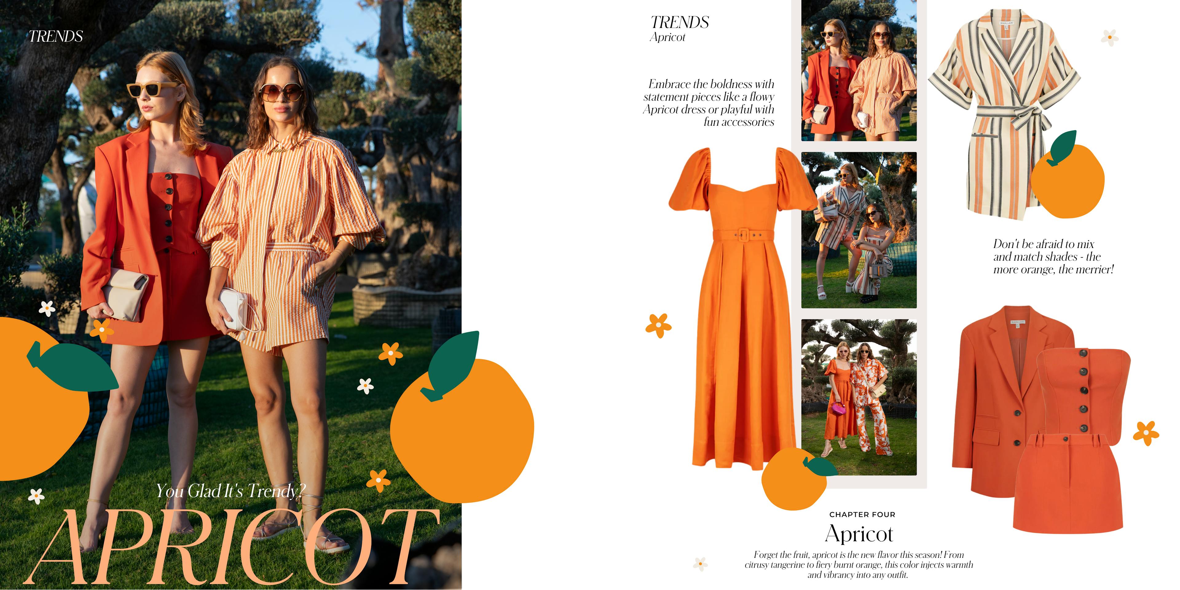 Dive into the vibrant world of apricot this season, where fruity zest meets fiery warmth in a palette that's as energizing as it is comforting. Forget the fruit; apricot is the new flavor of fashion, offering a spectrum from citrusy tangerine to intense burnt orange. This hue brings a much-needed dose of optimism and tranquility to our wardrobes, reflecting a world in search of solace and vibrancy.