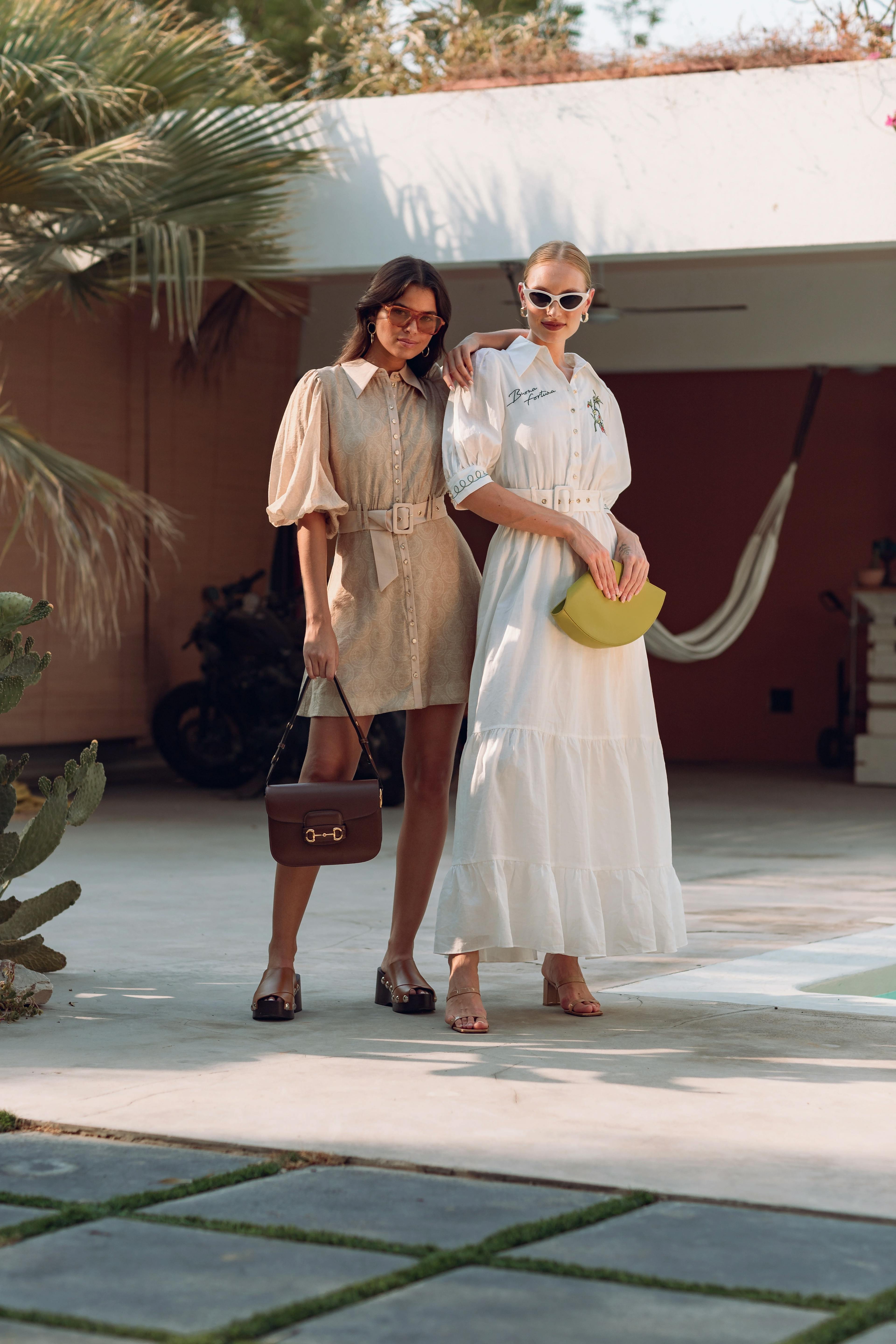 If you’re more of a vanilla girl at heart, you’ll be glad to hear that neutrals are still a solid choice for this time of year (sidenote: is there any time of year they’re not?!). This beige linen dress will see you right through to autumn when we’ll be teaming it with suede knee boots, but for now, we’re loving wooden clogs and seventies-inspired accessories for a Jane Birkin-esque style tribute. If ever in doubt of what to wear in the heat, summer whites are always a safe bet. White shirt dresses, jeans, or relaxed tailoring will feel super fresh and clean for both day or night. We recommend investing in light linens, embroidery anglaise and structured cotton for breathable pieces that will beat the heat.