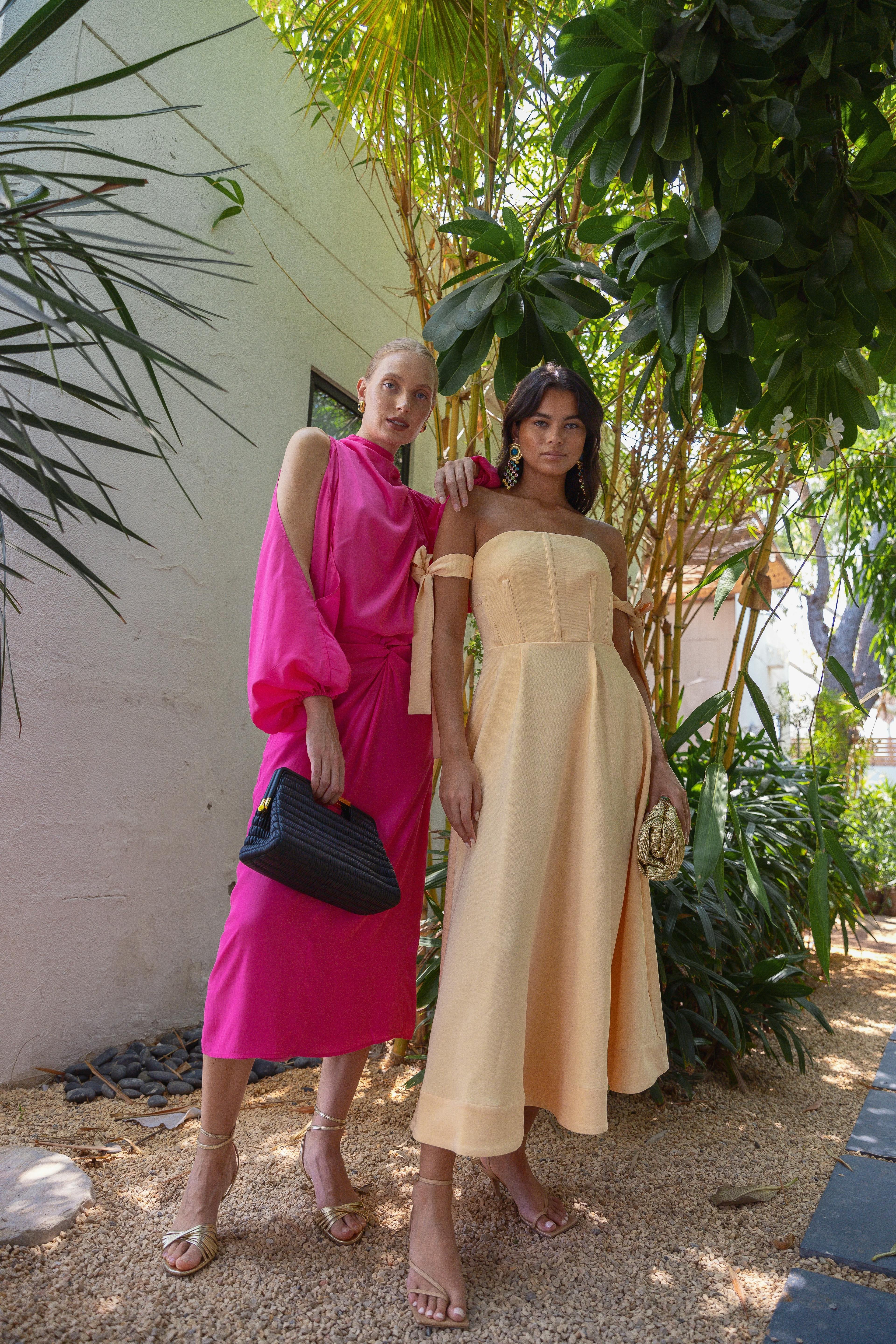 The first step to turning down the voltage on your high summer looks, is to swap out overly summery patterns (we’re looking at you, jungle palm prints and bright blooms) for a block color. Fuchsia pink and buttermilk yellow are a modern choice at the top of our list right now that still feel super seasonal. Look for feminine fits with voluminous sleeves or flare skirts to keep a playful pep in your step through the sunshine months.