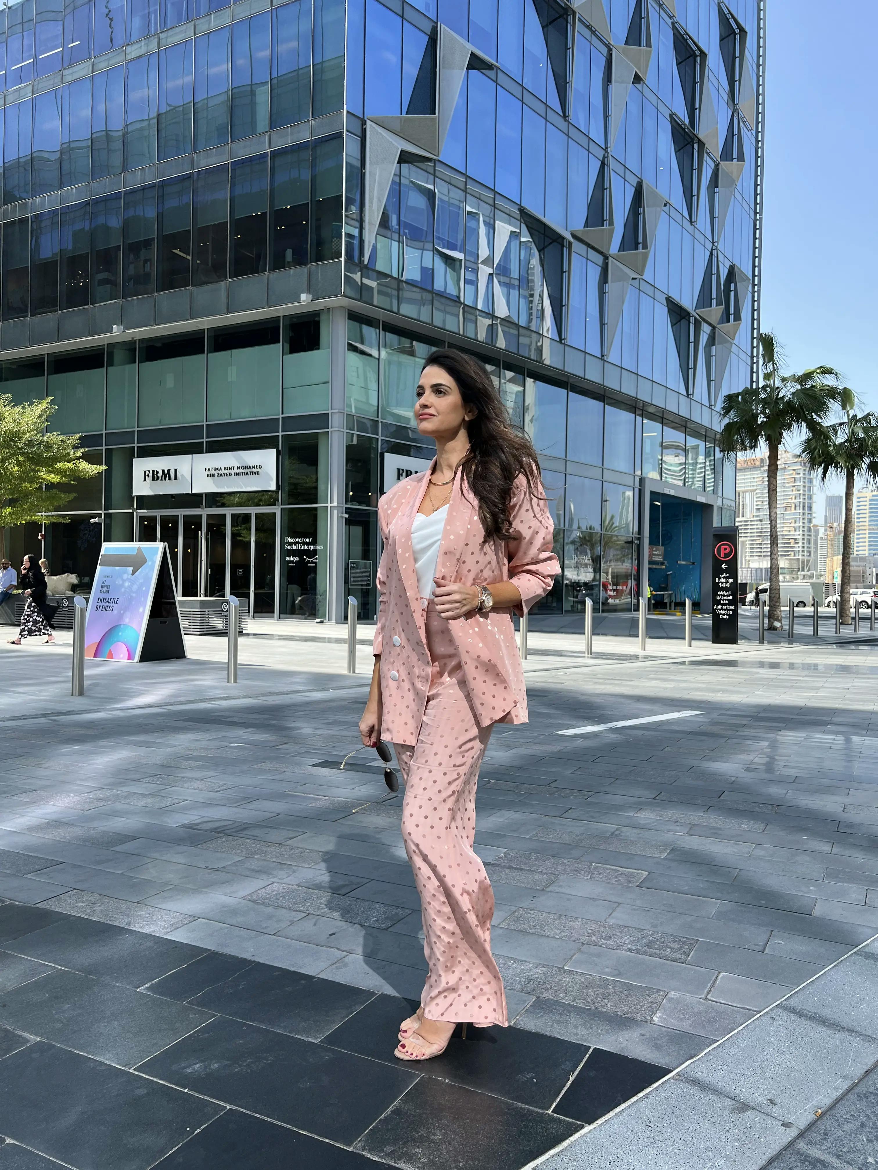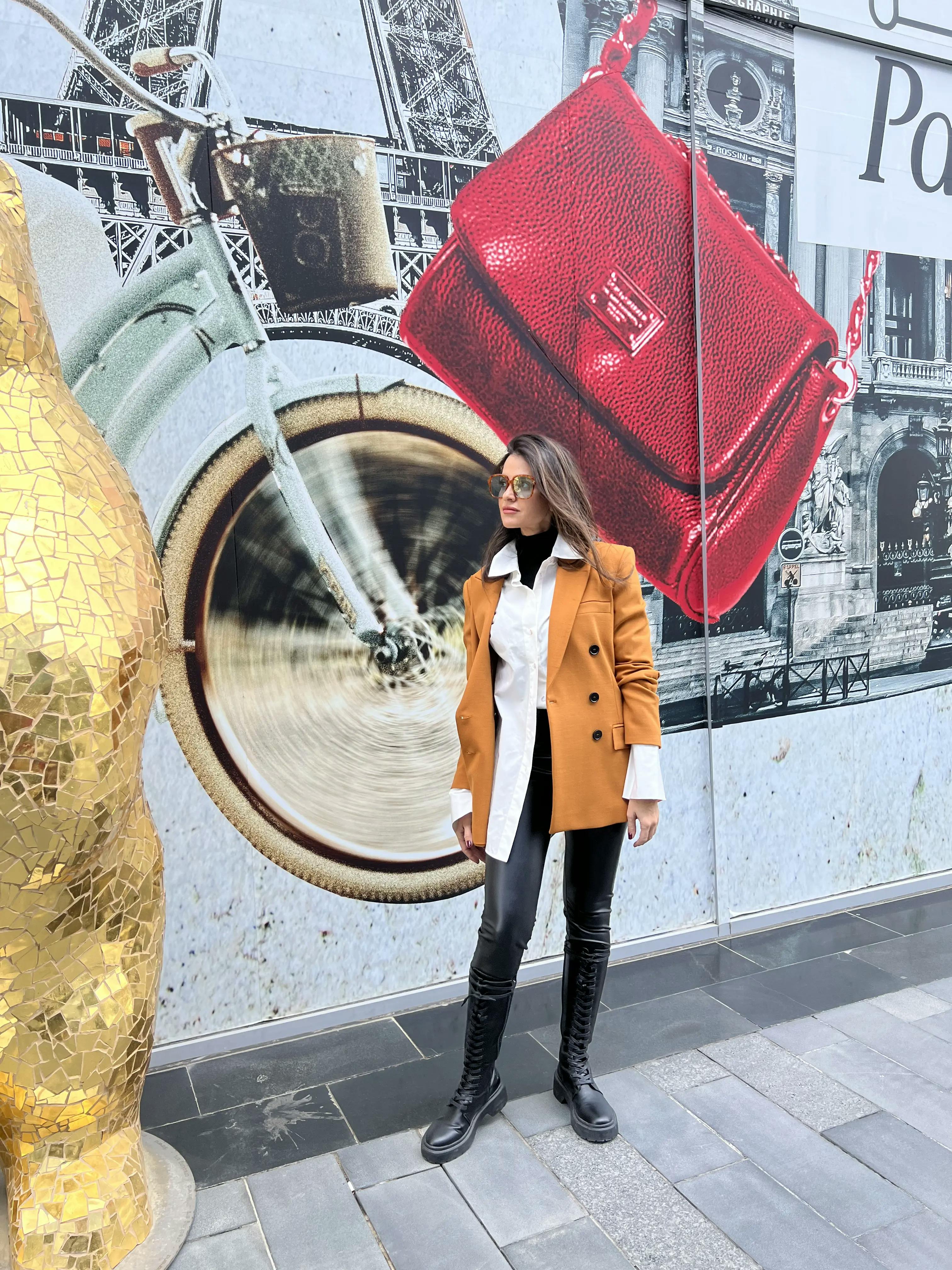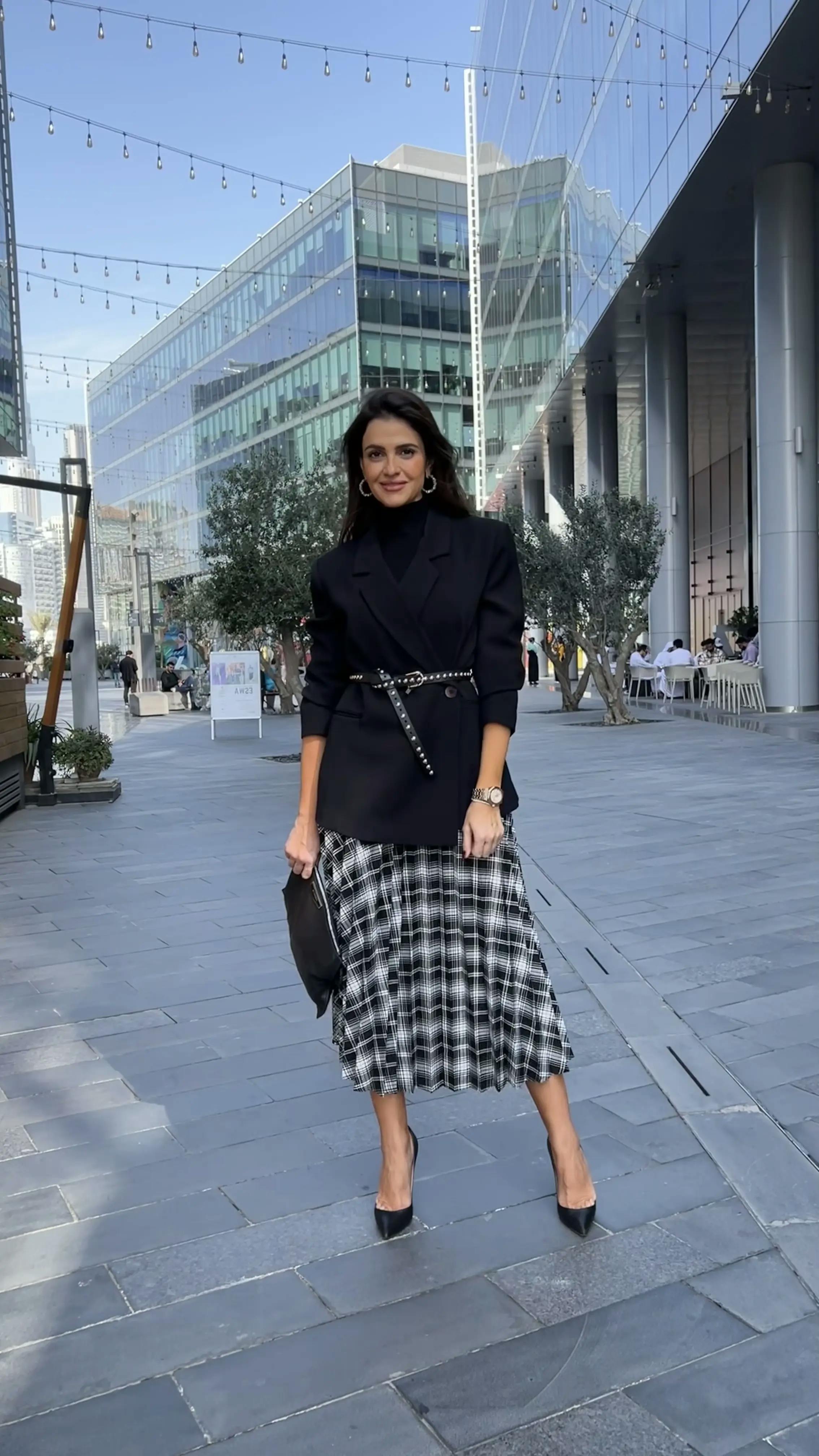 If you find some pieces too figure hugging but still want to create a feminine shape, Malak recommends taking your favorite double breasted blazer and belting it over a flared feminine skirt. As a finishing touch, I like to slouch the sleeves up but this is optional!